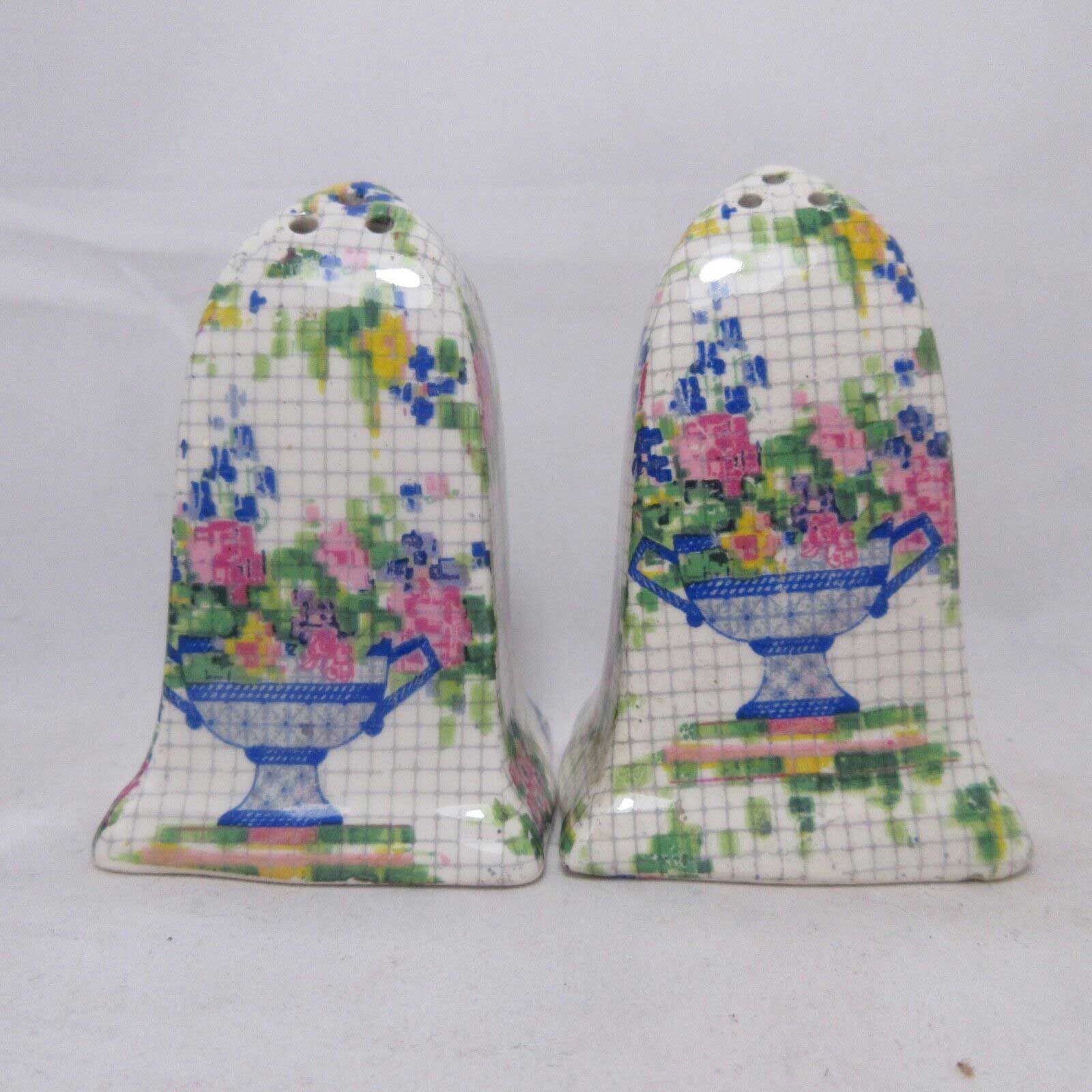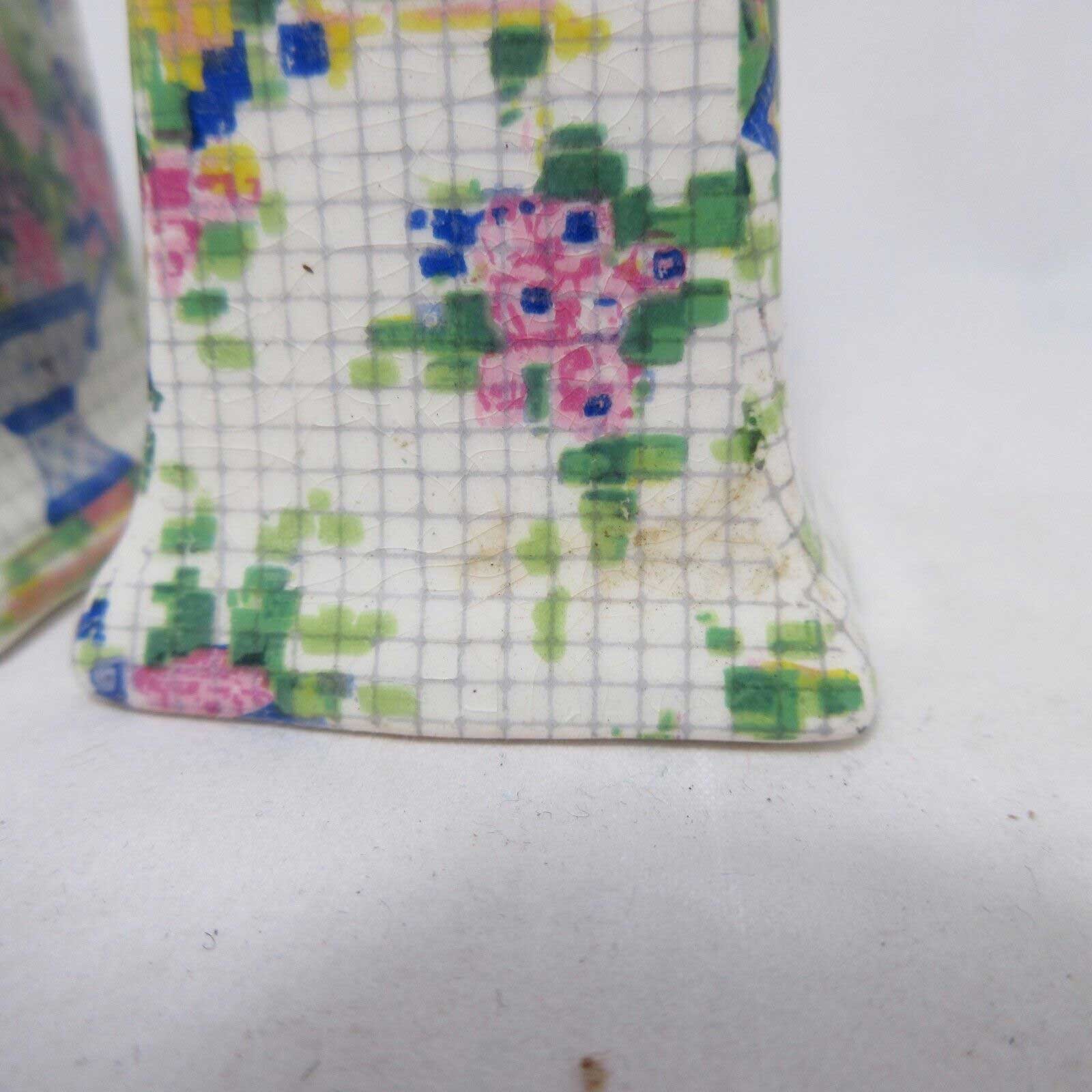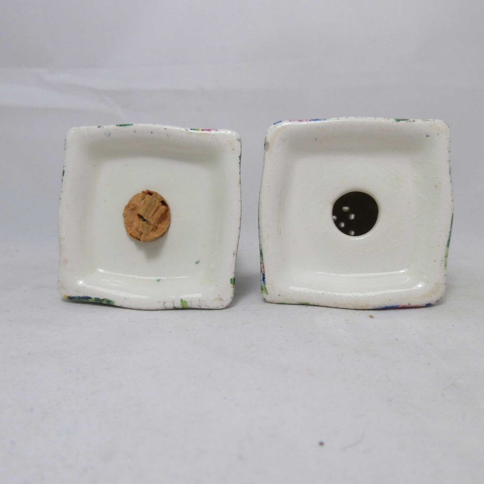 Approx. 2.5″ tall. Very good condition. Pepper shaker has crazing in enamel. Both have no plugs.